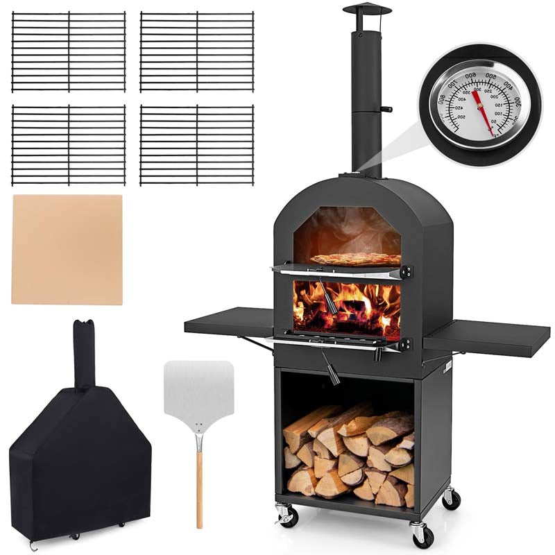 Outdoor Wood Fired Pizza Oven with Firewood Storage, Side Tables, Pizza Stone & Cover, Portable Pizza Maker on Wheels for Outside Charcoal Grill